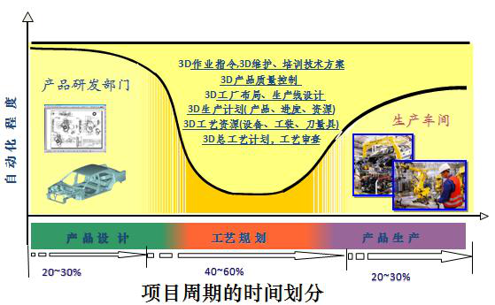 在产品研发部门,基本上实现了3D CAD产品设计;生产现场大量采用自动化设备(现场总线、PLC等);但是,在时间消耗最长的生产规划部门,设计手段却较为落后。传统的制造工艺均是以二维图纸为基础,过份依赖规划人员的经验水平,不能及时发现工艺规划中的错误,且与设计处于串行的工作模式,这样导致工艺规划处于一个信息孤岛,自动化程度低,产品研制周期长,成本高,不能满足现代工艺制造的需要。因此,数字化制造解决方案定位在于提升工艺设计部门的核心能力、弥合制造鸿沟.