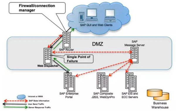 当一个客户端请求SAP服务时,路由器将其发布到单点部署的一台Web Dispatcher的虚拟地址(VIP)上。Web Dispatcher这个时候会和另一台服务器Message Server进行通信,让Message Server对SAP服务器集群实现健康状况检查。Web Dispatcher只有在知晓服务器集群的健康状况后,才能进行负载均衡的工作。这样的实现方式存在诸多弊端: