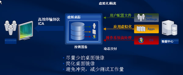 桌面虚拟化是用虚拟电脑环境的产物,取代实体计算机交付到用户端。虚拟计算机被存储在远程服务器中并且可以交付应用到用户设备上。它的操作方式和操作实体机器相同。一台服务器可以交付多个个性化虚拟桌面镜像。IT部门可以在数据中心、而不是在每个用 户的桌面管理众多的企业客户机,这就减少了现场支持工作,并且加强了对应用软件和补丁管理的控制。 管理PC向来棘手,而没完没了的应用软件升级、补丁及反威胁更新更是让这项工作困难重重。即便有基于网络的安装和补丁管理工具来减轻负担,IT部门还是把太多时间花到了桌面上,处理个人软件、多个版本的ActiveX控件、驱动程序或者DLL冲突、恶意软件感染、配置不当的硬件等引起的诸多问题。